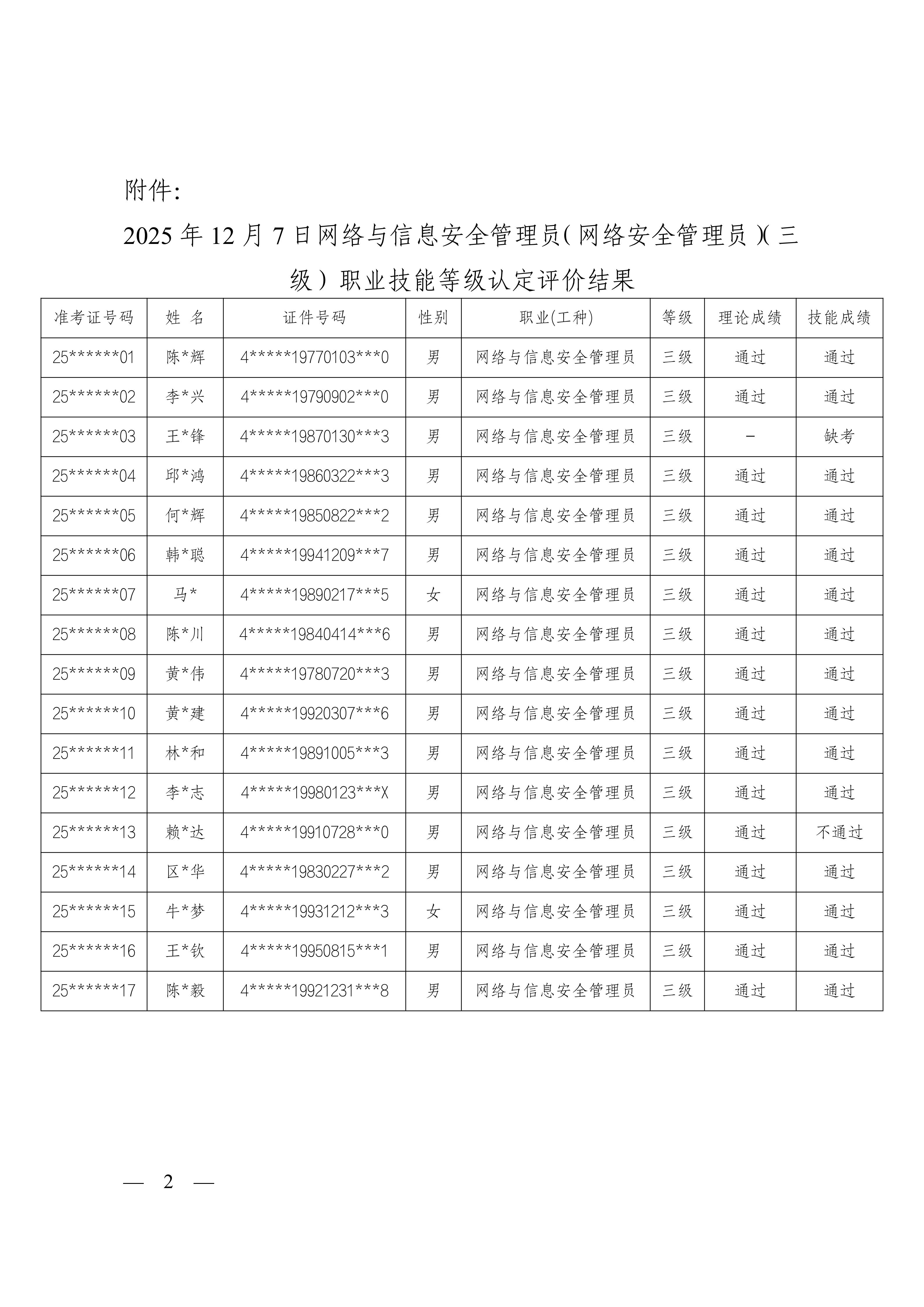 2025年12月7日网络与信息安全管理员(网络安全管理员)(三级)职业技能等级认定评价结果公示的通知