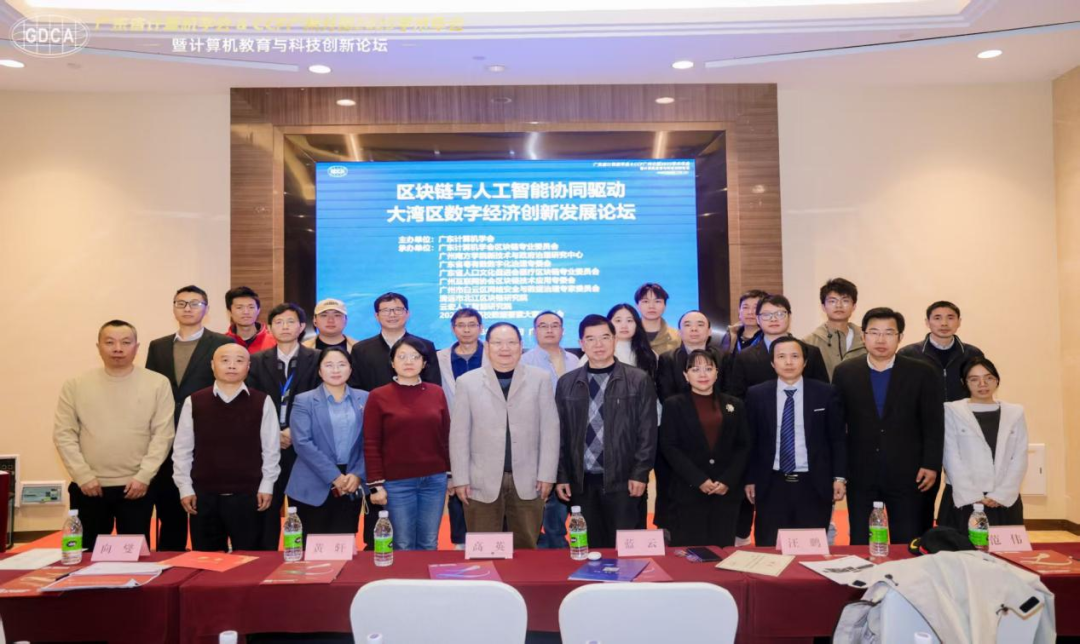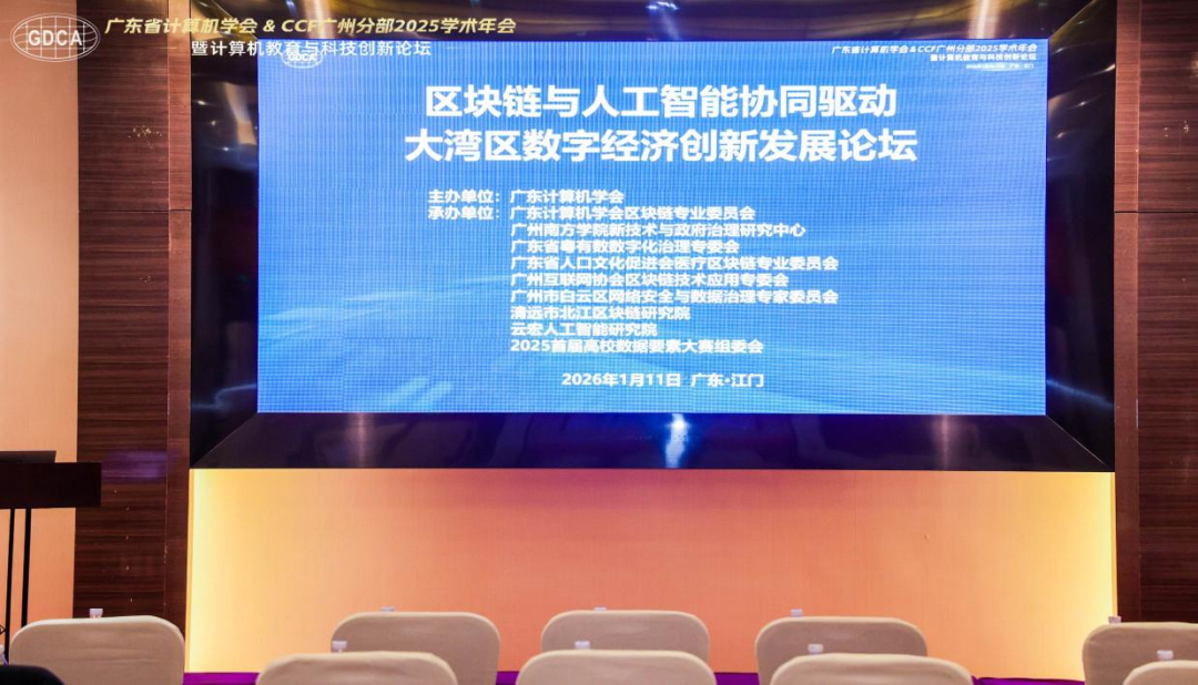 2026年1月11日上午,在广东省计算机学会& CCF广州分部2025学术年会暨计算机教育与科技创新论坛期间,广东省计算机学会区块链专业委员会联合广州南方学院新技术与政府治理研究中心、广东省粤有数数字化治理专委会、广东省人口文化促进会医疗区块链专业委员会、广州互联网协会区块链技术应用专委会、广州市白云区网络安全与数据治理专家委员会、清远市北江区块链研究院、云宏人工智能研究院和2025首届高校数据要素大赛组委会在江门新会龙泉度假酒店成功举办了“区块链与人工智能协同驱动大湾区数字经济创新发展论坛”,广东省计算机学会区块链专委会副主任委员兼秘书长、教授级高级工程师黄建新,南方学院特聘教授、广东省计算机学会区块链专委会副主任委员蓝云为执行主席,广东省计算机学会理事长韩国强教授,广东省数智科技研究会理事长、华南理工大学国家卓越工程师学院执行院长、博士生导师高英教授,广东省计算学会副理事长兼秘书长黄轩正高级工程师,广东省计算机学会区块链专委会副主任委员、北京大学深圳研究生院深圳市内容中心网络与区块链重点实验室主任雷凯研究员(科技部区块链重点研发项目负责人),中山大学日语系教授、五邑大学特聘教授、五邑大学人文与政法学院院长佟君教授及来自广东省区块链、人工智能、数字经济及新能源领域的专家学者、高校老师和学生、行业组织与企业代表线下和线上参会。