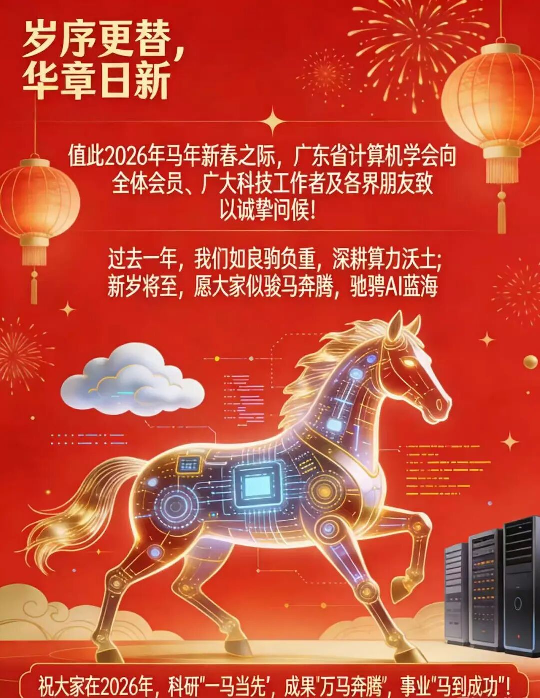 值此2026马年新春,广东省计算机学会向您致以诚挚祝福!愿您如骏马驰骋AI蓝海,科研一马当先,成果万马奔腾,事业马到成功!新春大吉,共谱华章!