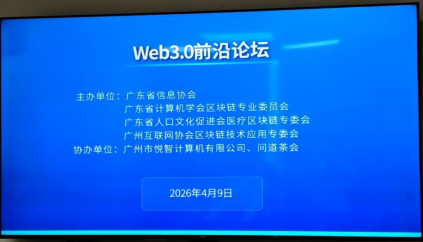 2026年4月9日下午,广东省计算机学会区块链专业委员会、广东省人口文化促进会医疗区块链专业委员会、广州互联网协会区块链技术应用专委会和广东省信息协会联合举办,广州市悦智计算机有限公司、问道茶会协办的“Web3.0前沿论坛”在广东省信息协会会议室成功举行,广东省计算机学会区块链专委会副主任委员兼秘书长、教授级高级工程师黄建新,广东省信息协会秘书长黎文坚为执行主席,来自广州及全国的Web3.0、区块链与数字金融领域的专家学者、行业组织与企业家代表参会。