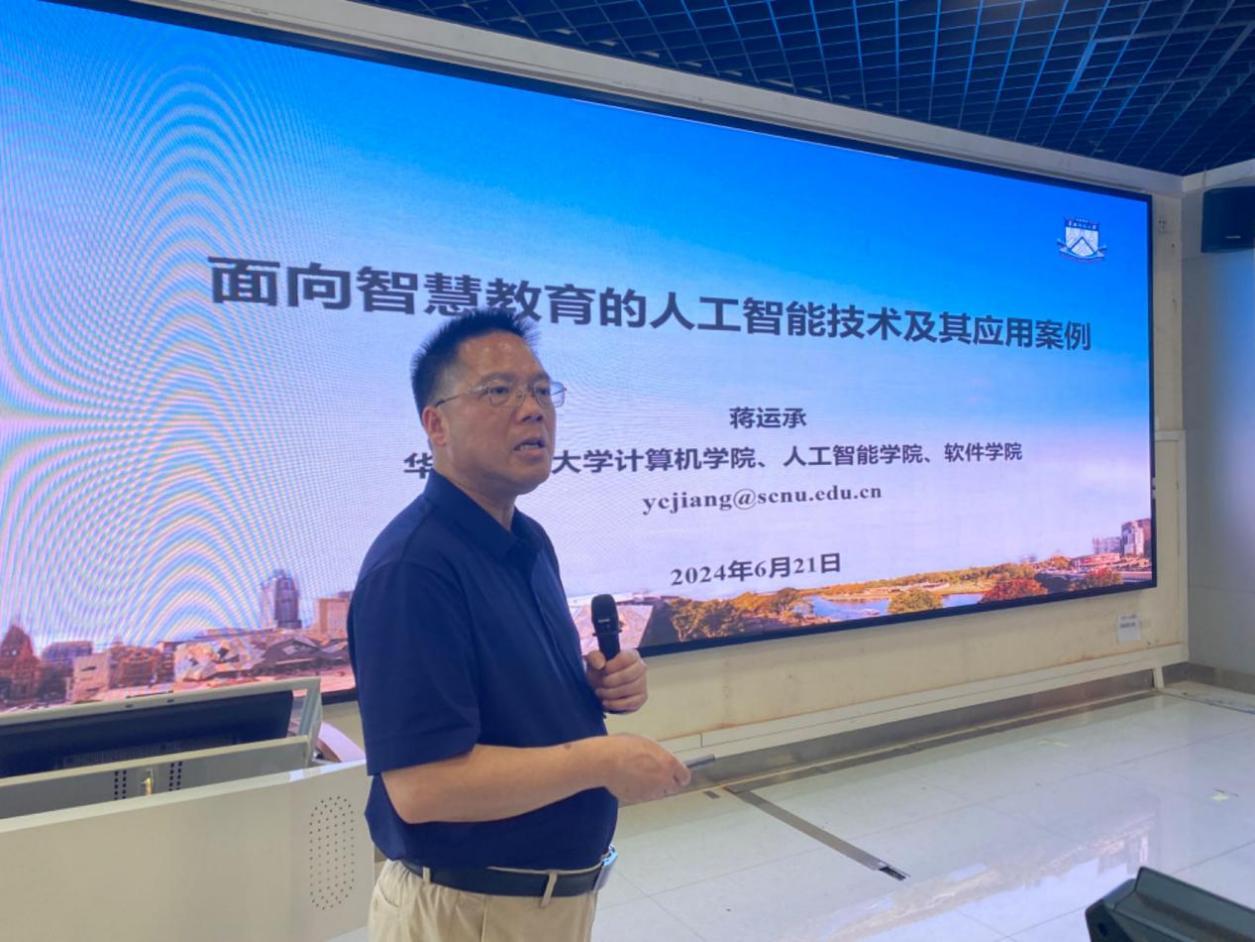 此次培训班的课程共分为两天半进行,以理论与实操相结合的形式,内容丰富,涵盖了人工智能技术的前沿知识及应用案例。第一天课程首先由华南师范大学计算机学院/人工智能学院/软件学院院长蒋运承教授、广东机电职业技术学院人工智能学院副院长赵静教授分别作“面向智慧教育的人工智能技术及其应用案例”、“中高职教师教科研能力提升路径”的专题报告。