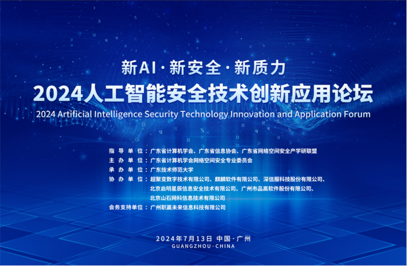 2024年7月13日,由广东省计算机学会、广东省信息协会、广东省网络空间安全产学研联盟指导,广东省计算机学会网络空间安全专委会主办,广东技术师范大学承办的“2024人工智能安全技术创新应用论坛”在广州顺利召开。