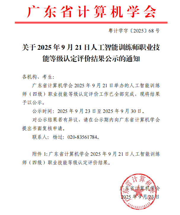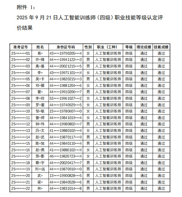 关于 2025 年 9 月 21 日人工智能训练师职业技能等级认定评价结果公示的通知